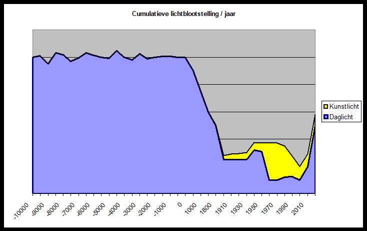 Gedurende de lange periode van de menselijke ontwikkeling is de mens aan relatief constante hoeveelheden licht blootgesteld. Significante veranderingen in de cumulatieve jaarlijkse blootstelling aan licht zijn achtereenvolgens opgetreden door: